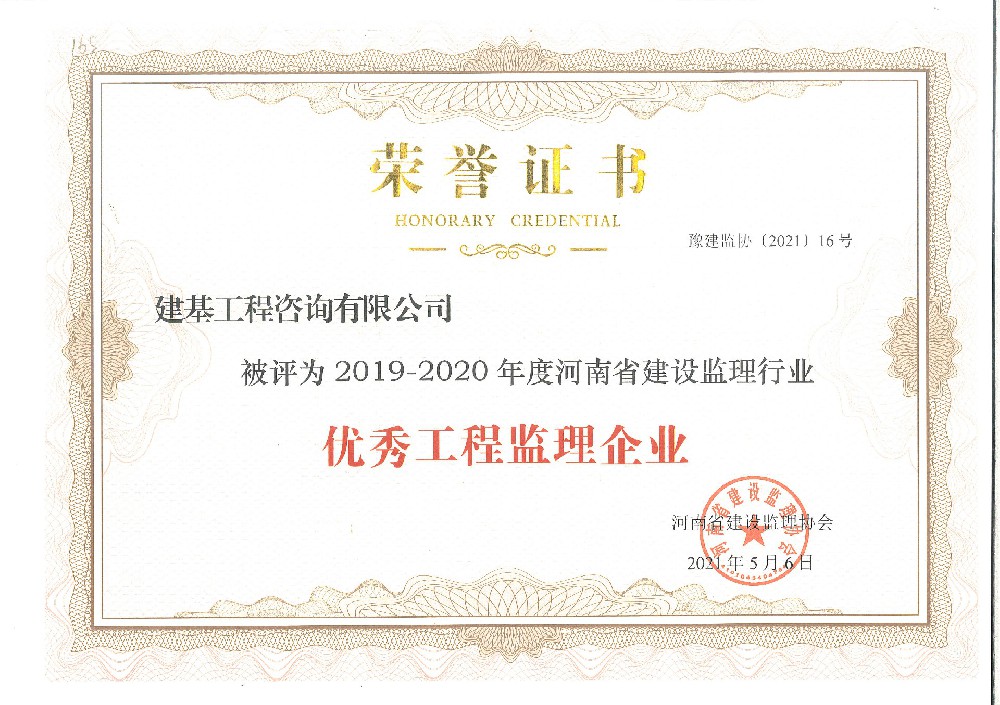 • 被河南建設(shè)監(jiān)理行業(yè)評(píng)為2019-2020優(yōu)秀工程監(jiān)理企業(yè)