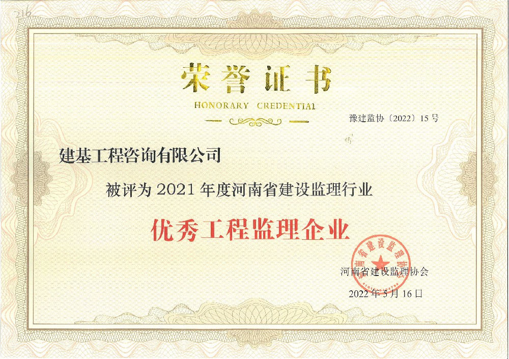 • 被河南建設(shè)監(jiān)理行業(yè)評(píng)為2021年優(yōu)秀工程監(jiān)理企業(yè)